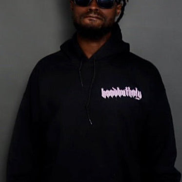 • Front: Small “Hoodbutholy” logo in Old English font (available in white, pink, and blue font)